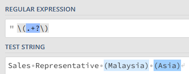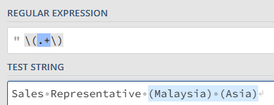 For example, in the string Sales Representative (Malaysia) (Asia), the regex pattern \(.+\) will output (Malaysia) (Asia).