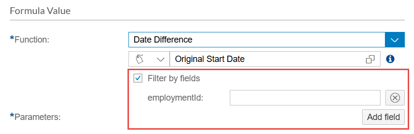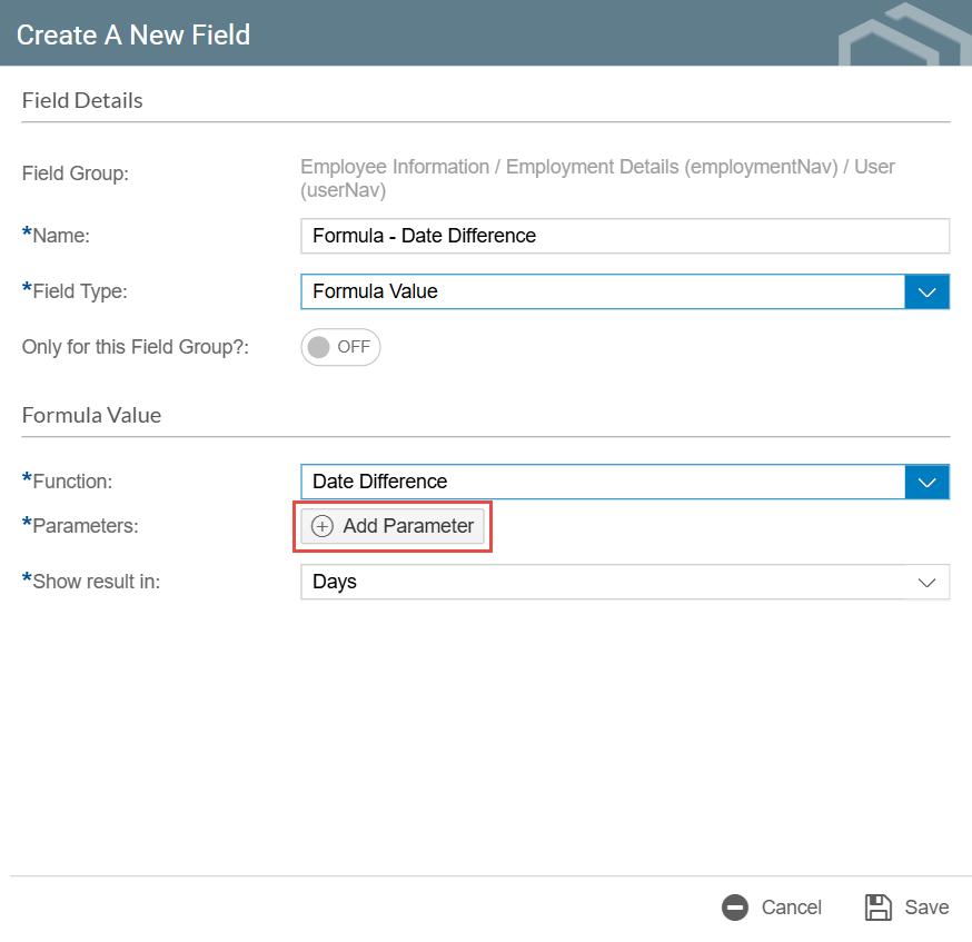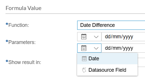 - After selecting Date Difference as the function for your Formula Field, click the Add Parameter button. This will add a parameter where you can define the dates to be compared. You can manually enter date values or use a Datasource Field in the parameters.