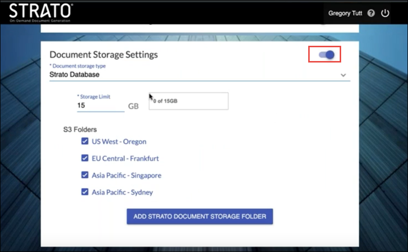 Once the Document Storage Settings toggle is switched on, the Strato database becomes active, and associated storage folders (such as AWS S3 folders) can be configured.
