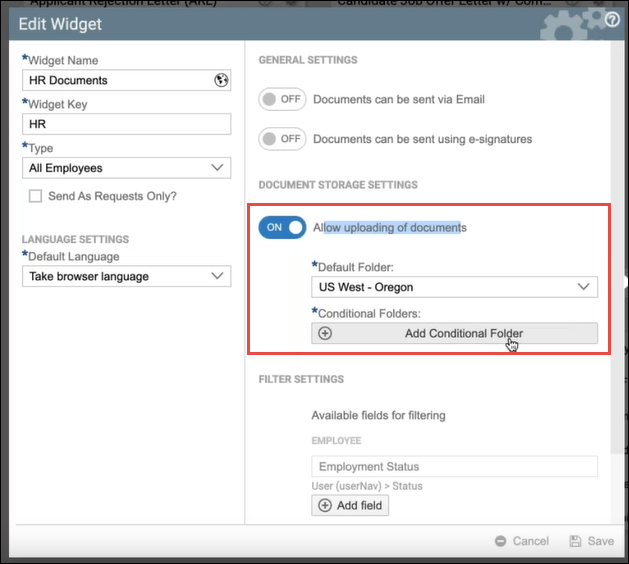 When creating or editing a widget, the Document Storage Settings section allows admins to enable document upload options and define a default storage folder (for example, based on region).