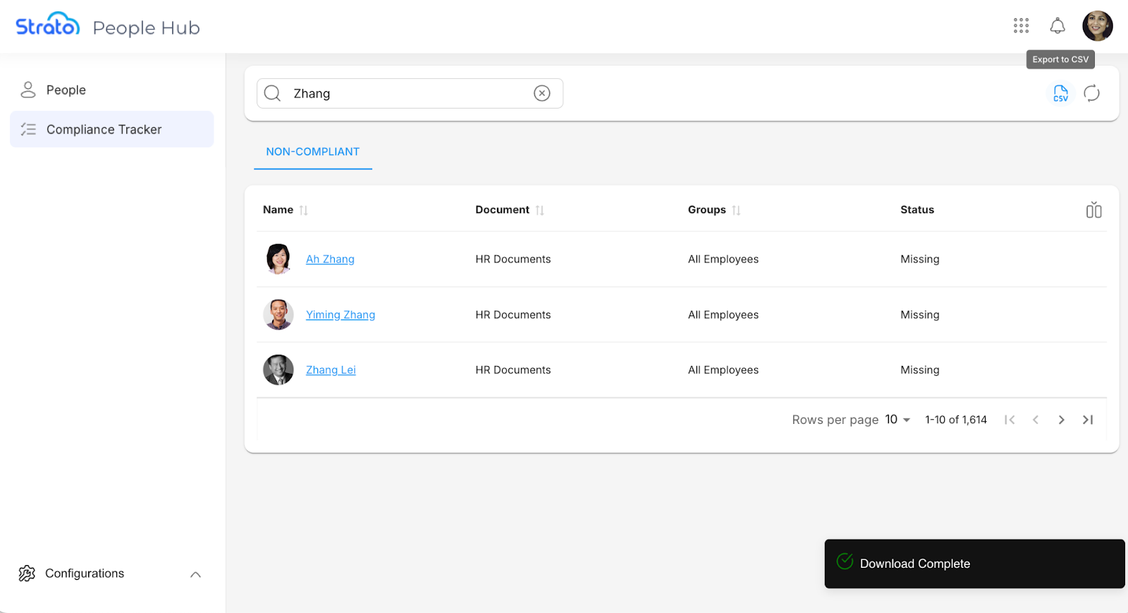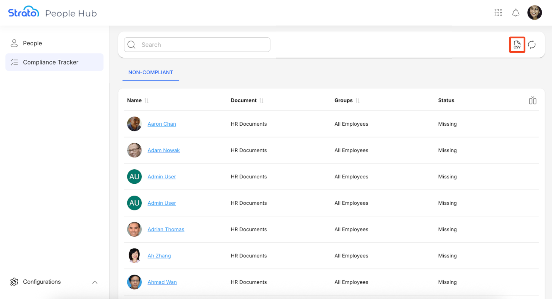 Admins can export the list of the employees' compliance status as a CSV file, for use in reporting and data analysis. To export the list, click the Export button.