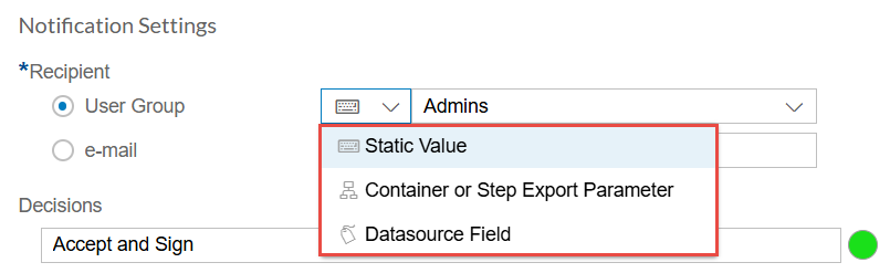 The Recipient in a User Decision Step in Strato Workflows can be set to either a User Group or an existing Strato user's email address. However, only the Email field allows for values to be defined through a Static Value, Container or Step Export Parameter, or a Datasource Field.