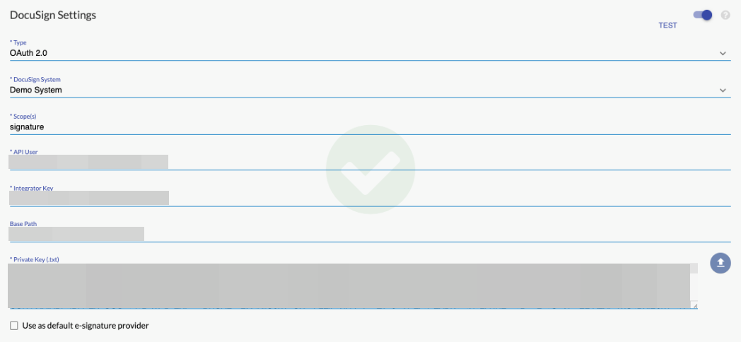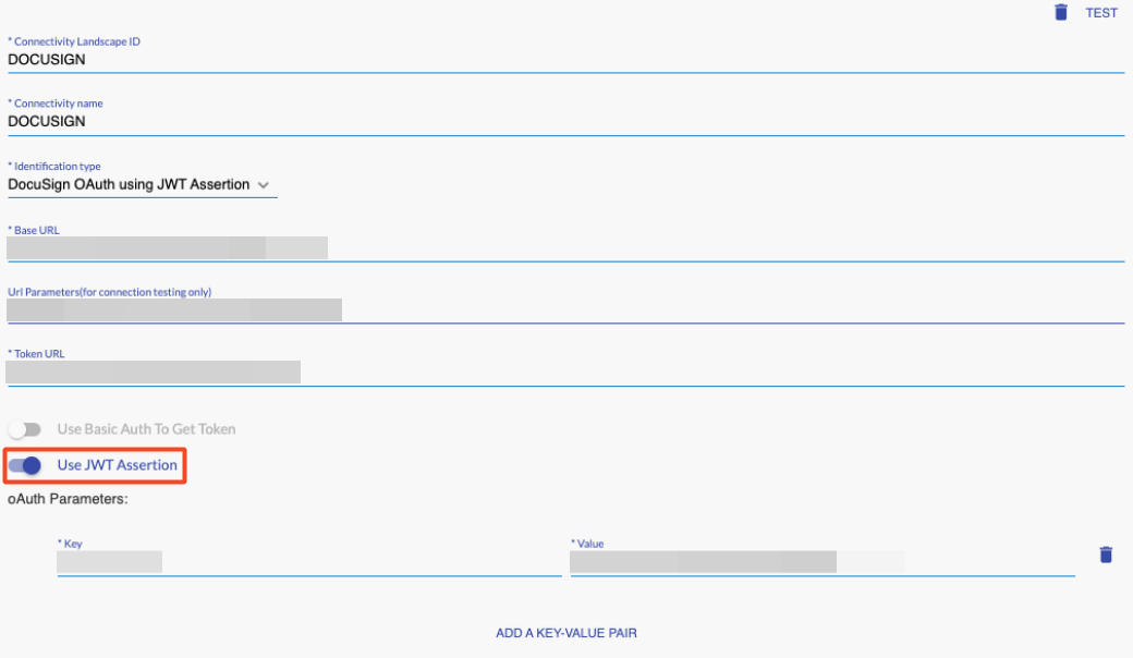 - If Docusign is configured as the external service, the step automatically uses the JWT Assertion for authentication.