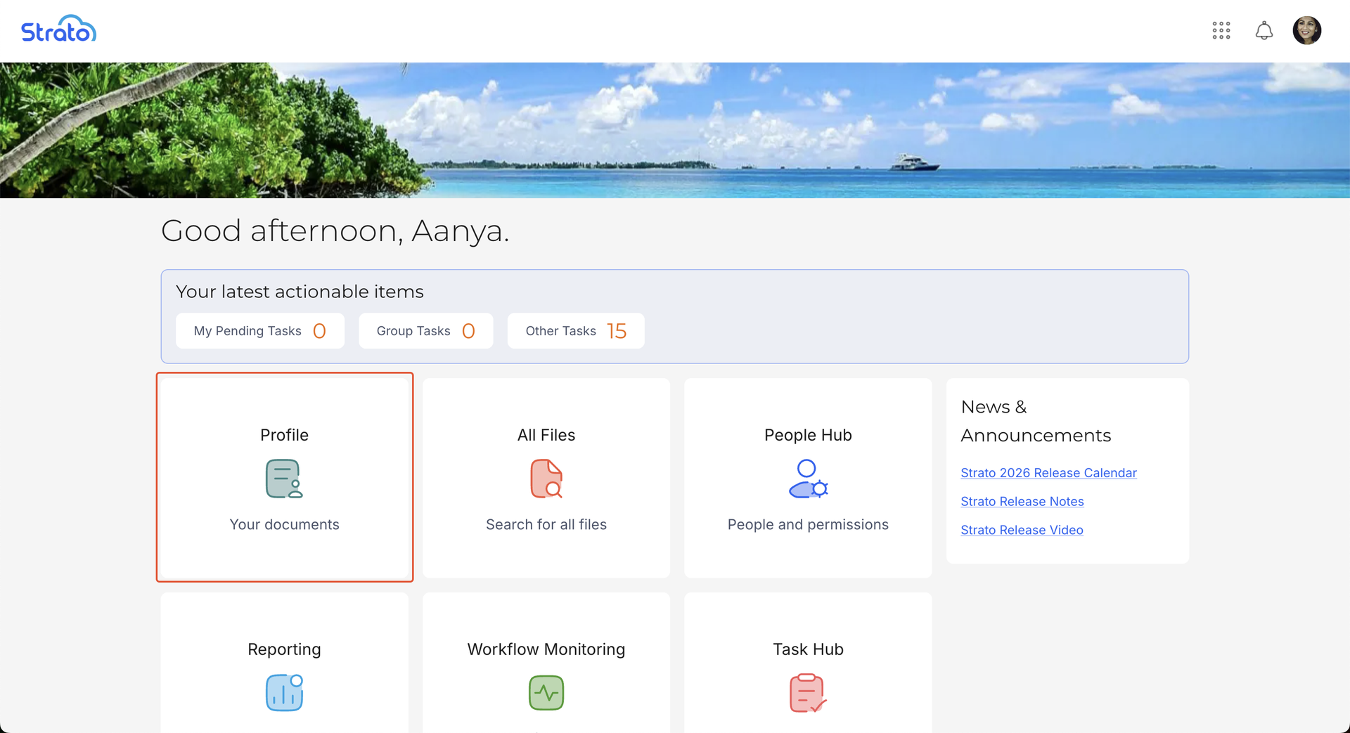 Users can access their Profile page by clicking the Profile card in the Strato Homepage.