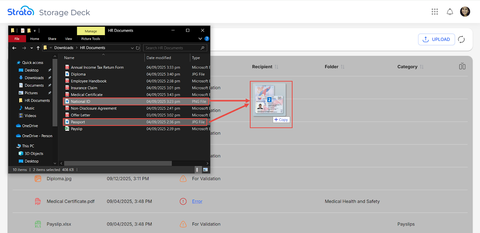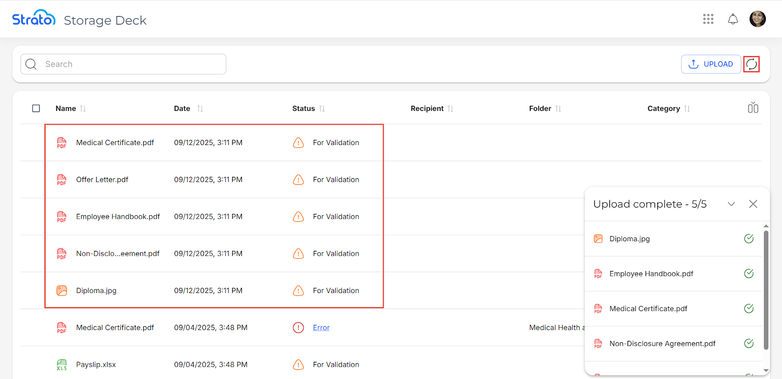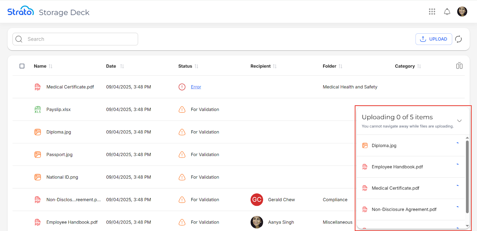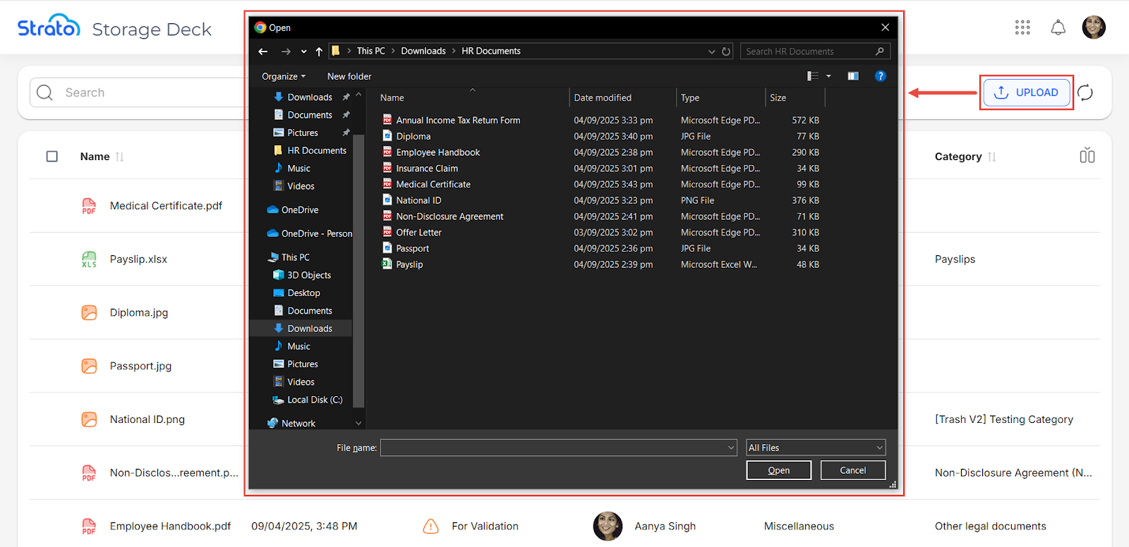 In the Storage Deck page, click the Upload button. This opens up your system window where you can choose one or more files to upload.