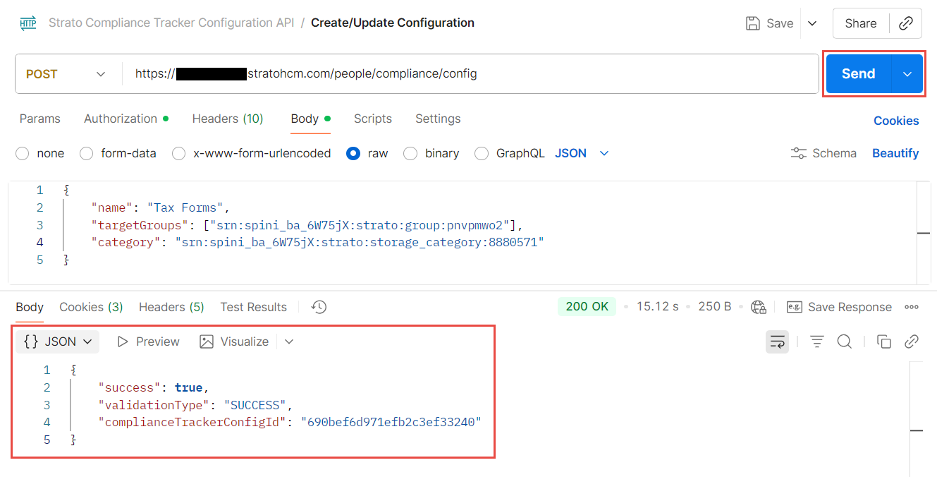 If no value is added, the default value set will be โNON-COMPLIANTโ.- Click Send. If done correctly, the API should return a success message and should be viewable in the Compliance Tracker.