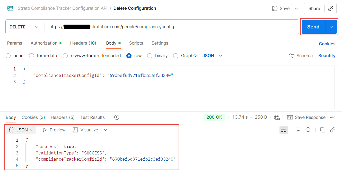 complianceTrackerConfigIdto the ID of the existing configuration you want to delete. - Click Send. If done correctly, the API should return a success message and the configuration should be gone from the Compliance Tracker.