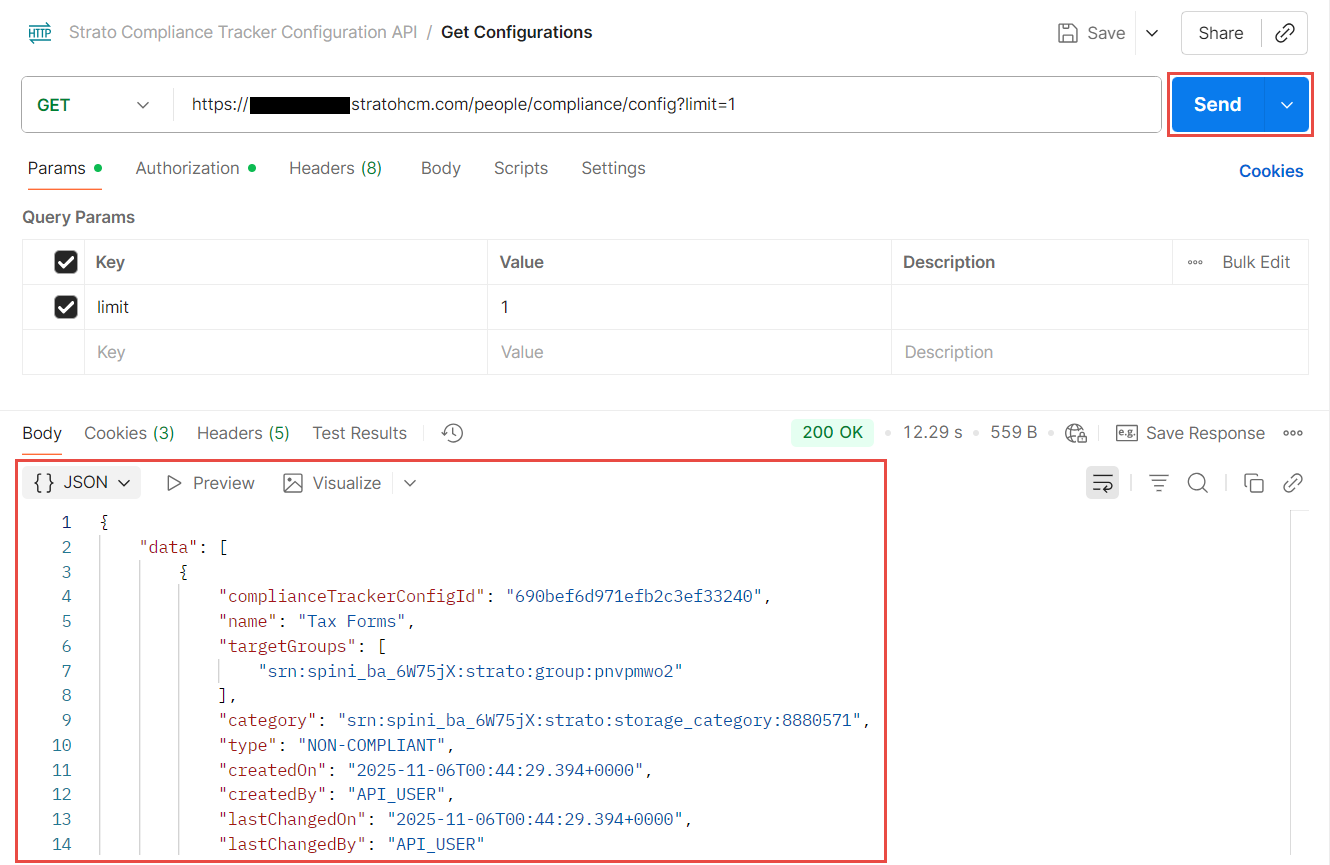 - Click Send. If done correctly, the API should return a success message, together with the list of configurations and their details.