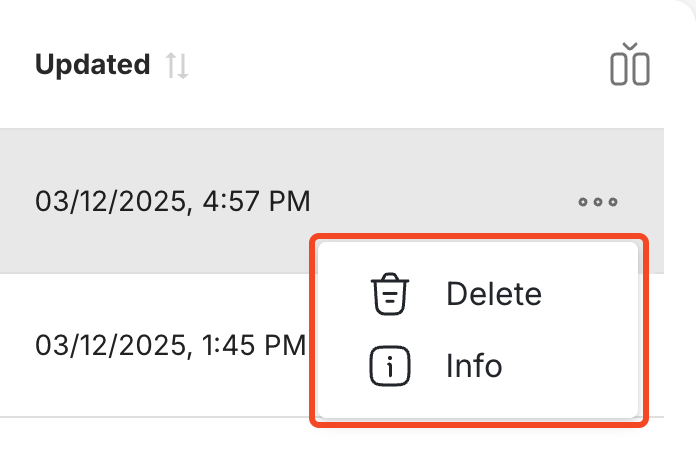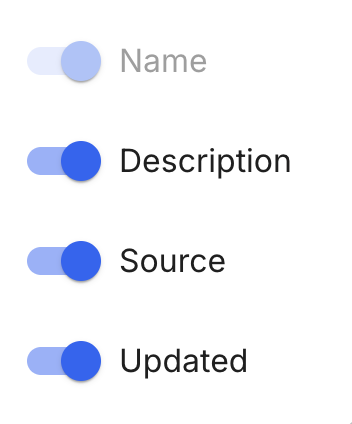 ![]() | The Show/Hide columns button allows you to toggle additional details on and off. Note that the Name column is enabled by default and cannot be toggled off. ![]() |