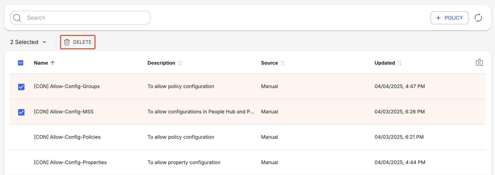 Delete is also available when you select Policies using the checkboxes. However, only Policies assigned manually can be selected using the checkboxes.