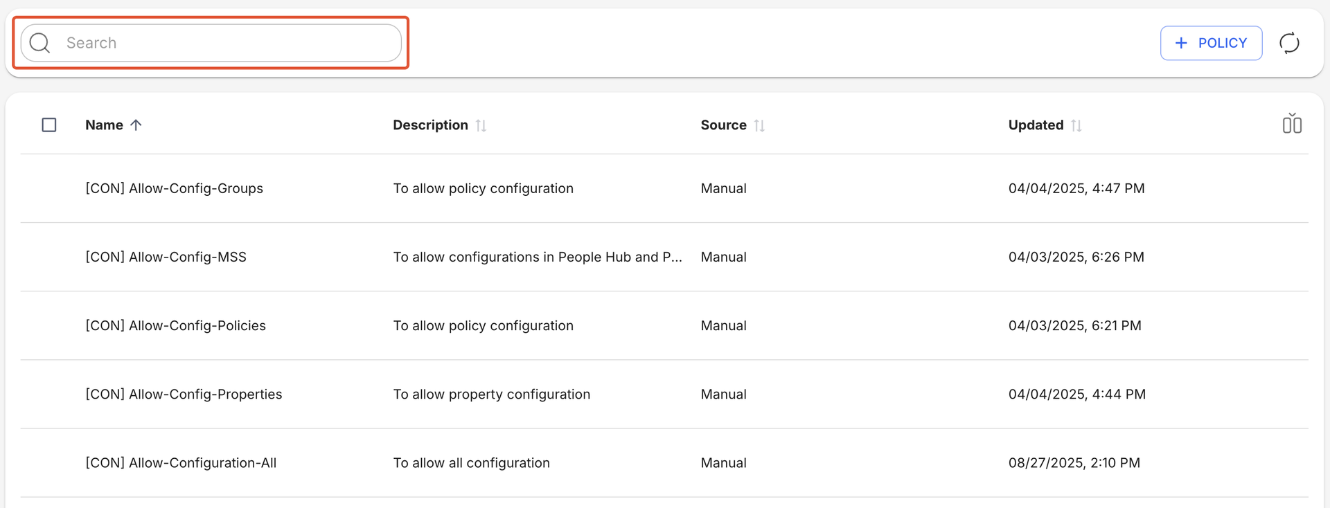 You can search for keywords using the Search bar located at the top of the Policy list. The search applies to the Name and Description columns.