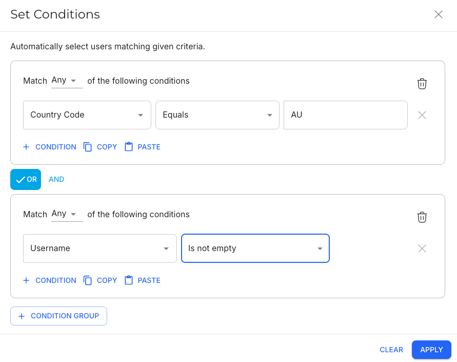 - You can create condition groups, where you can define which User Properties to check (for example, Country Code), how to compare it (for example, Equals), and values to compare it to (for example, AU). You can string multiple condition and condition groups together.