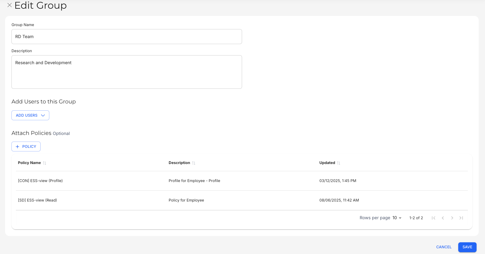 Optionally, you can attach Policies to a Group. Click the Add Policy button to open the Attach Policies modal.