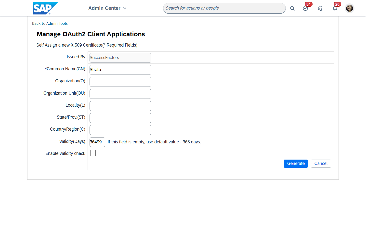 To resolve this issue, go to Manage OAuth2 Client Applications in your SuccessFactors instance. In your client application, generate another X.509 Certificate and set the Validity (Days) field to 36499 (approximately 100 years).