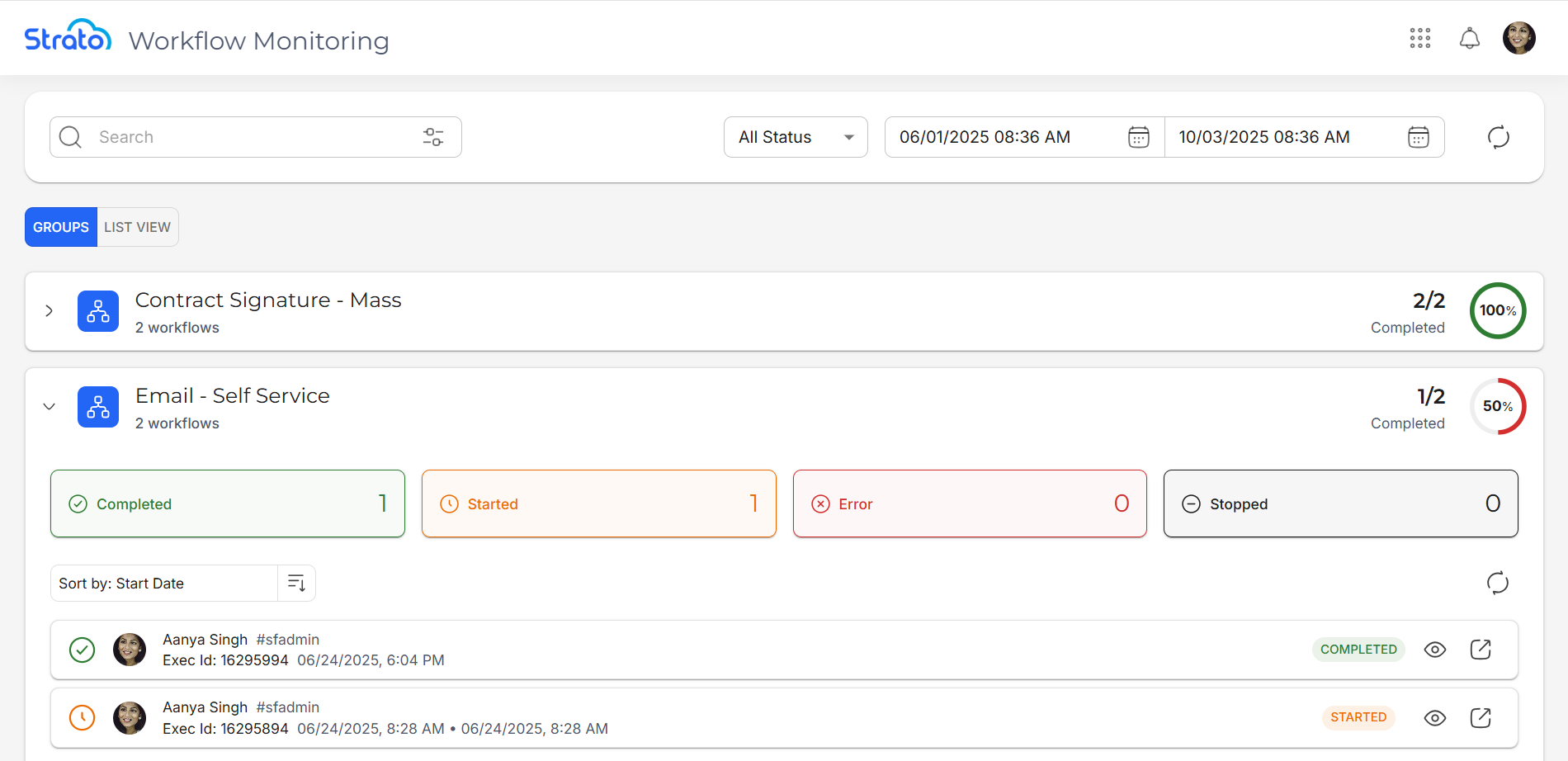 Strato Document Generation now features Workflow Monitoring, providing users with enhanced visibility into the statuses of all executed Workflows. This new capability allows for greater transparency and easier tracking of document generation processes.