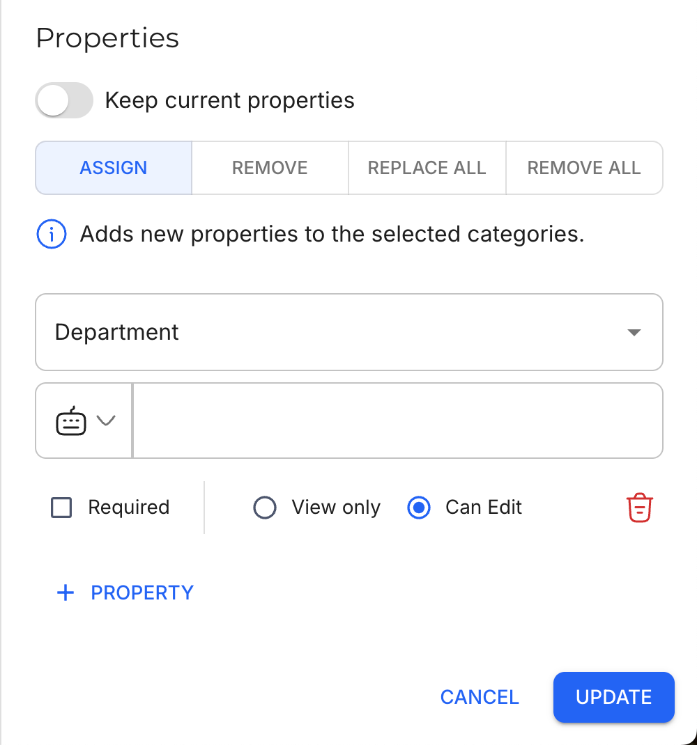 Assign | Adds the properties to the selected Categories.