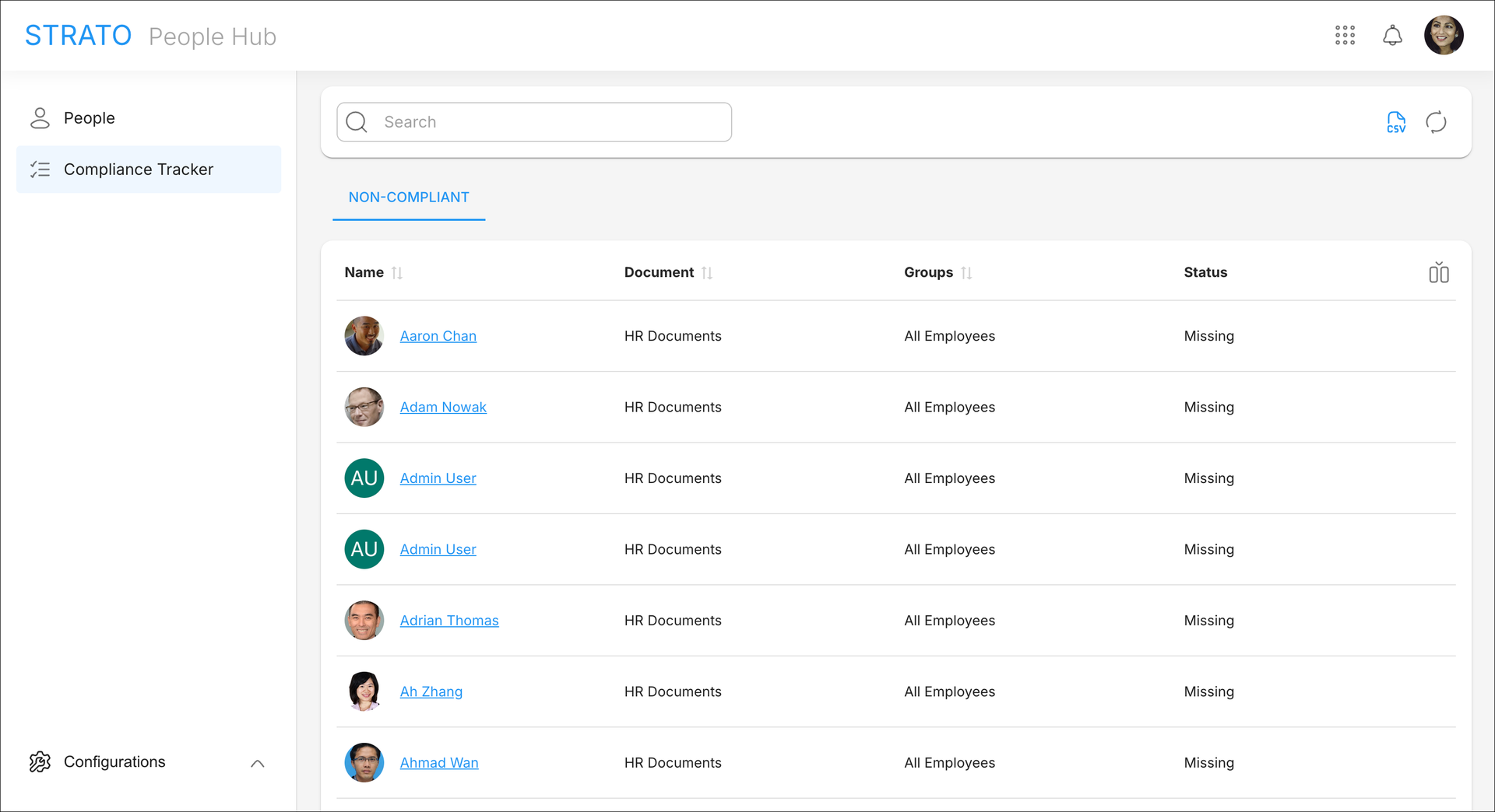 - View the list of all employees with missing compliance documents, and search within the list for users, documents, and Groups