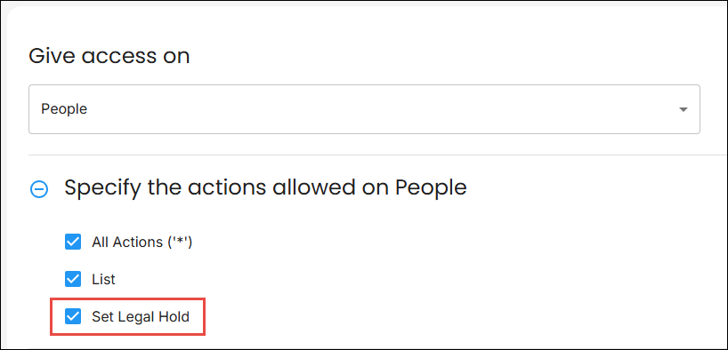 The Authorization Framework now allows Policies to define Set Legal Hold permissions. The Set Legal Hold permission is an Action under the People Tool.