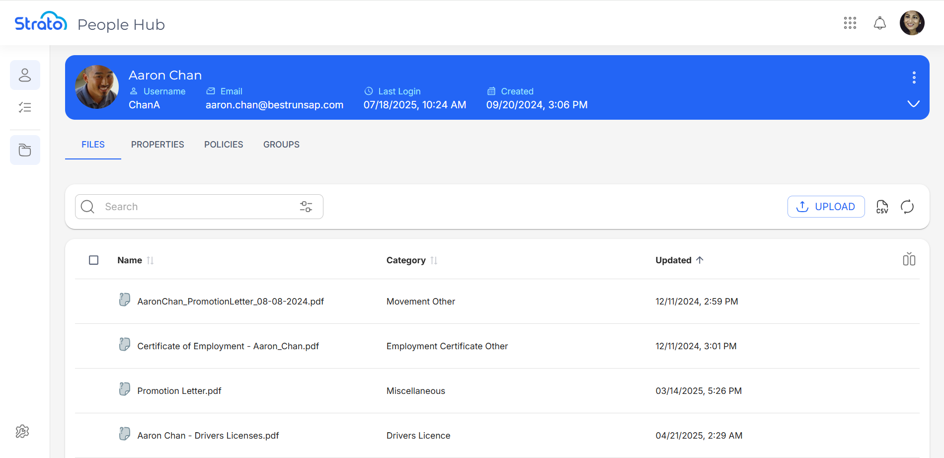 ![]() | The Upload button allows you to upload a file. The Recipient of the file will be the user that is currently being viewed. Uploading a file opens the Upload Files panel, where you can select the assigned Category and the Destination Folder of the file. ![]() |