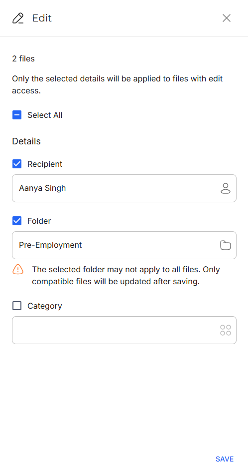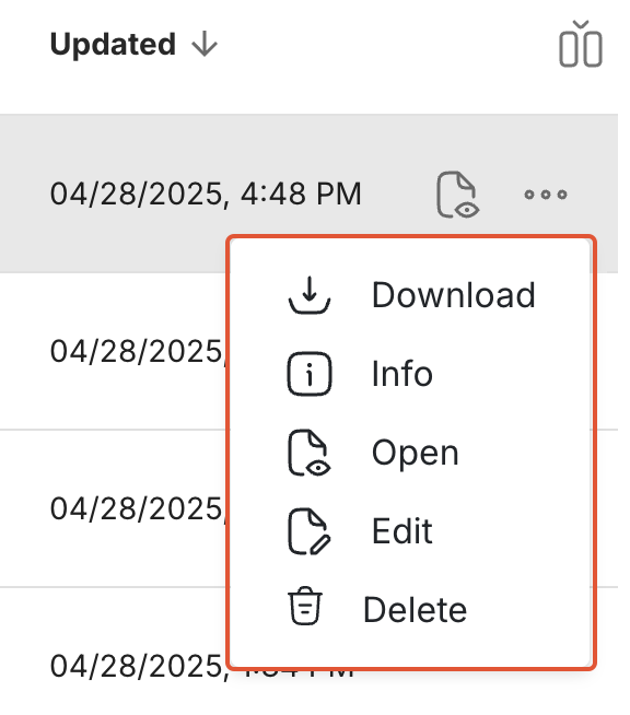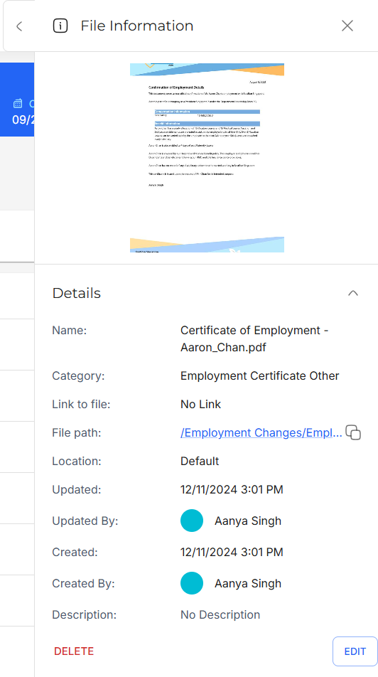 Edit | Opens the Edit side panel where you can modify the details of the selected file.