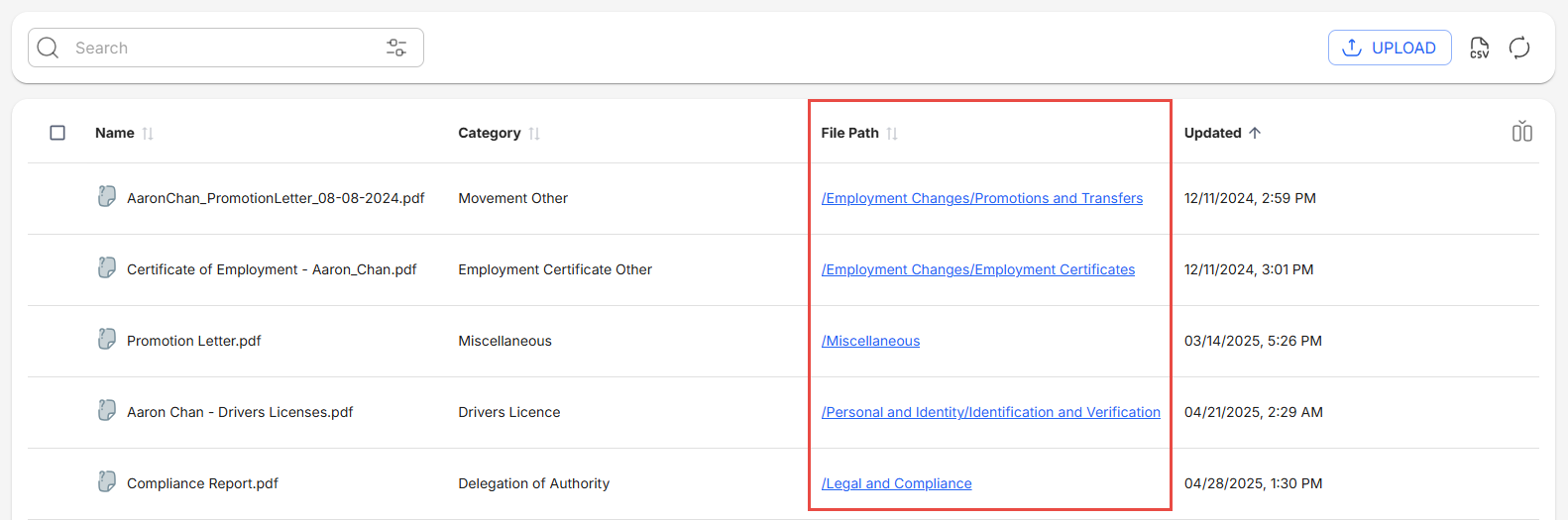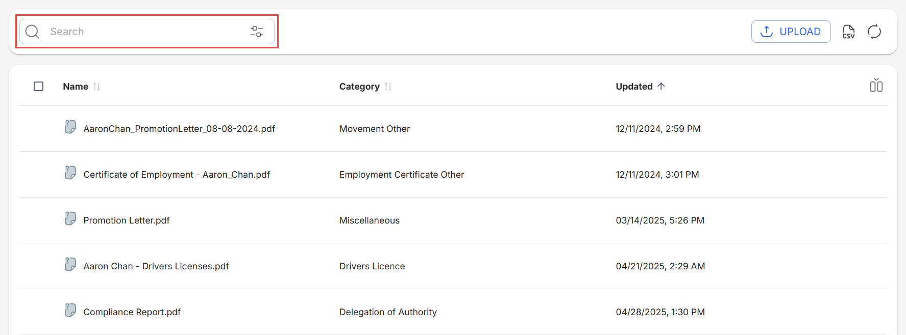 ![]() | The Export to CSV button allows you to generate a CSV file of all available files. This file includes all active columns and download links for each file, and reflects any current filtering applied through Basic and Advanced Search. |