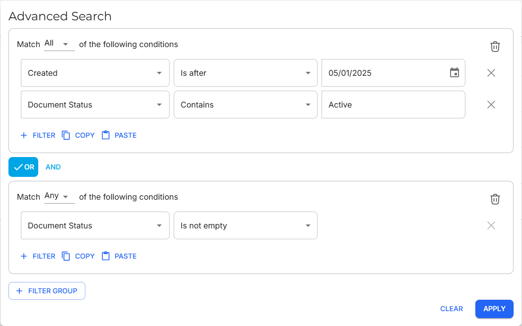 To do an advanced search, click the Filter icon. You can create condition groups, where you can define which file Properties to check (for example, Created), how to compare it (for example, Is after), and values to compare it to (for example, a date such as 05/01/2025). You can string multiple conditions and condition groups together.