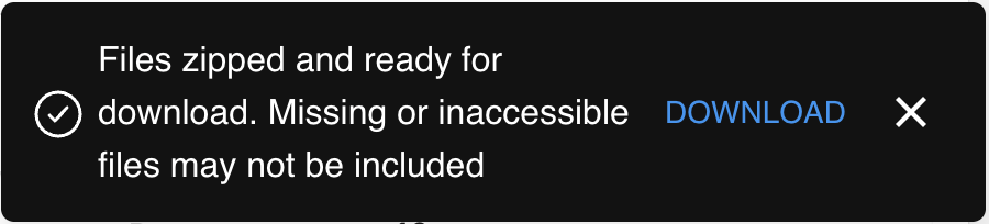 When the download is ready, a message will appear with a link to the Downloads page. The message may also note if any missing or inaccessible files were not included.