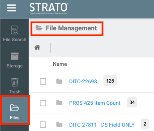 Once the integration is enabled, the navigation experience in Strato Document Management is updated. The File Search tab is removed from the side navigation.