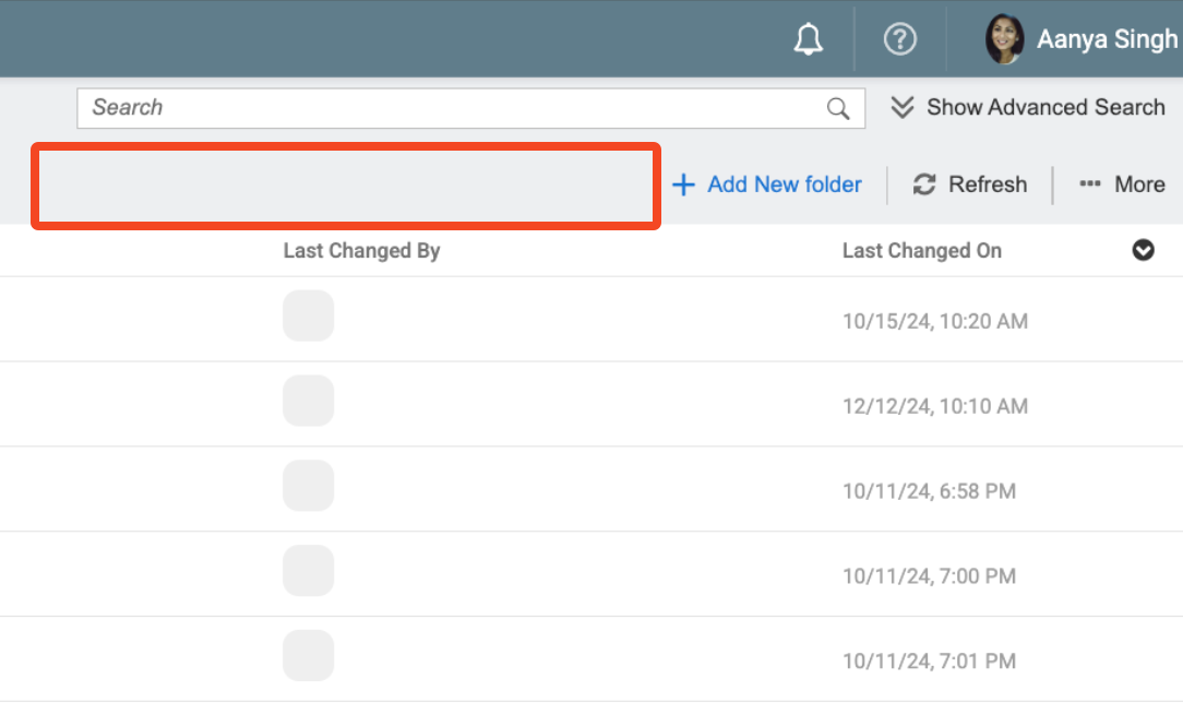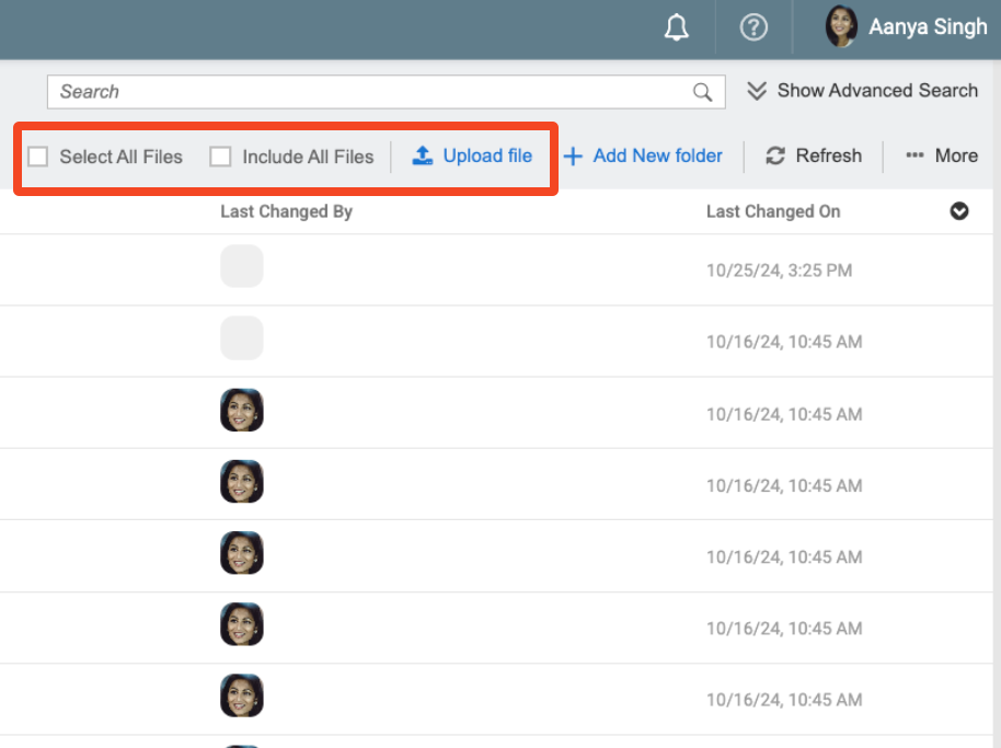 The Folder Management view is simplified to support policy-based access control. File upload functionality is removed, including the Upload button and drag-and-drop support. Users can no longer select all files or include all files in bulk actions. Only global files will be displayed, and access is governed by configured policies in the Authorization Framework.