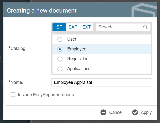 This will prompt a Creating a new document dialog box, where you can set which Catalog the Form Template will reference and the name of the Form Template. Click Apply once done configuring.