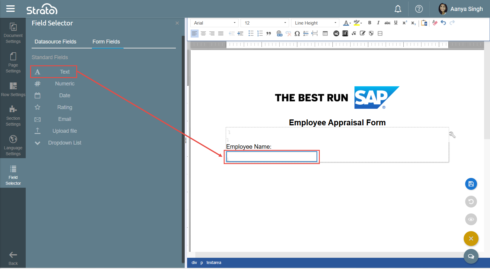To add Form Fields to the Form Template, position your cursor where you want the Form Field to be placed and go to the Field Selector > Form Fields, then select from the list of Form Fields.