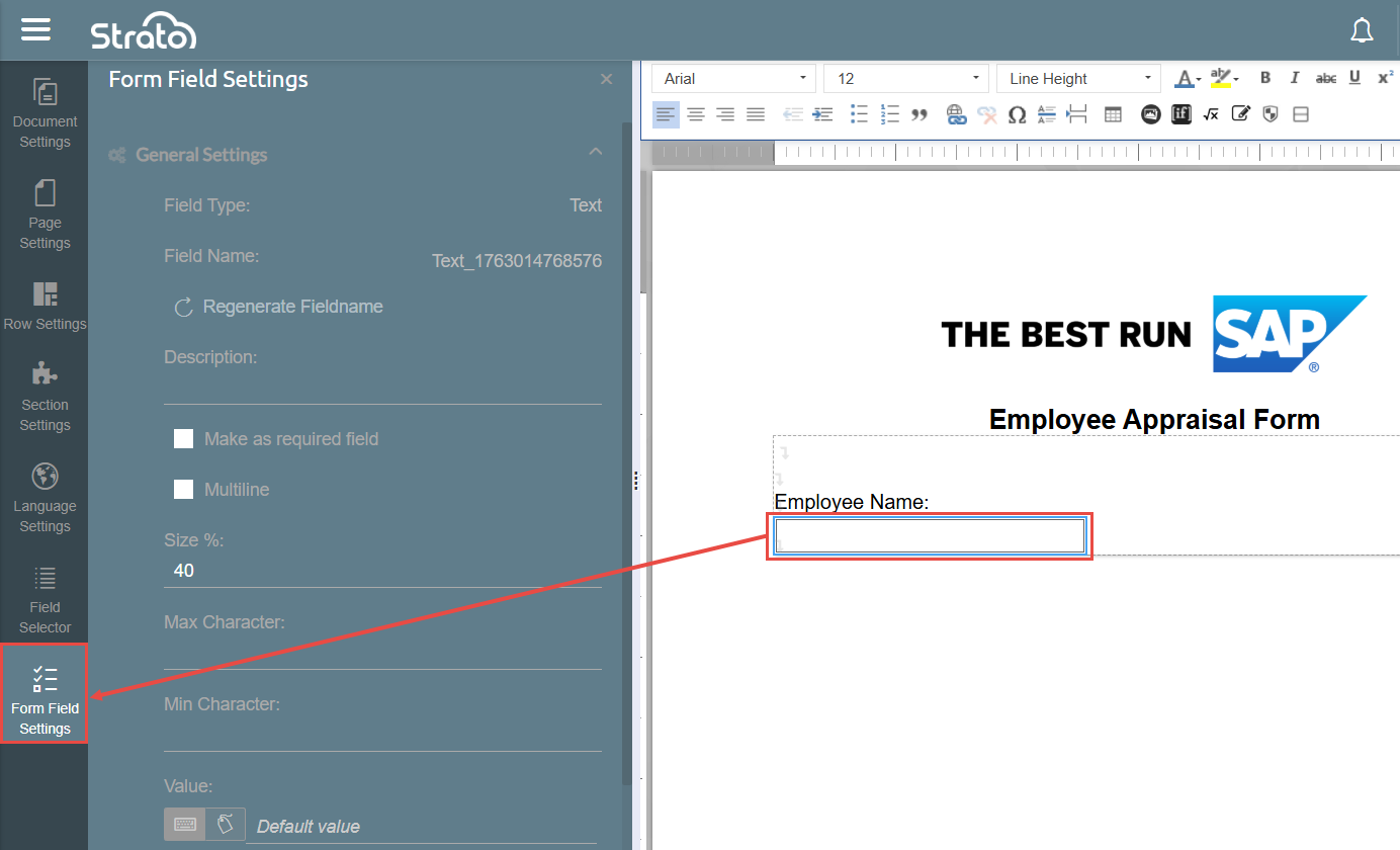 To edit the properties of Form Fields, click the Form Field on the template and then click on Form Field Settings that appears in the leftmost side bar. You can adjust properties like width, character limits, and default values in the Form Field Settings.