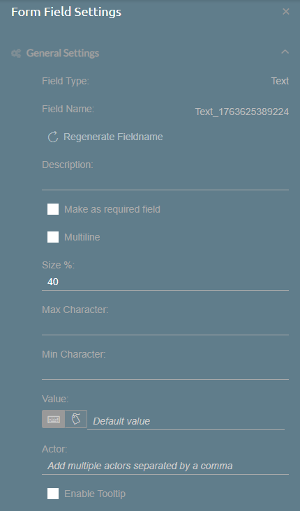 - Field Name: Unique name for the Form Field. You can regenerate a new Field Name through the Regenerate Fieldname button below.