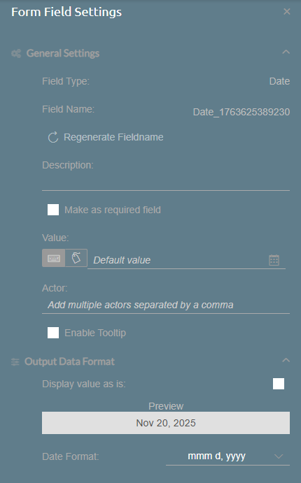 - Preview: See a preview of how the date would look like when inputted to the Form Field.