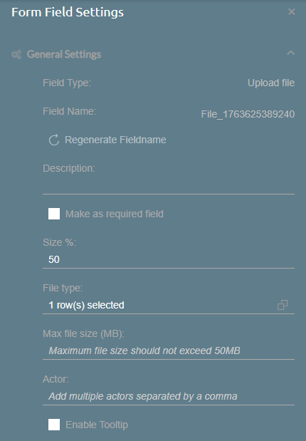 - Field Type: Indicates the Form Field Type, in this case, Upload File.