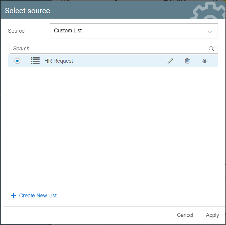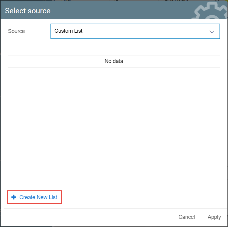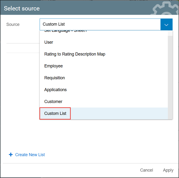 - From the Select source window that opens when selecting Dropdown List Options, select Custom List.