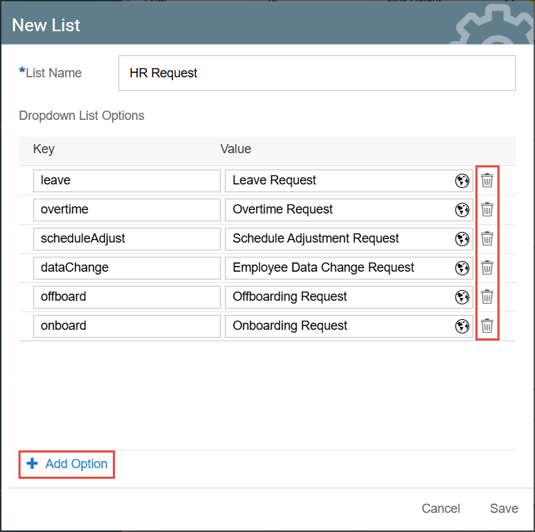 - The New List window will appear. Fill in the List Name, as well as the Key and Value of each option in the list. You can add more options through the Add Option button, or delete an option through the Delete button.