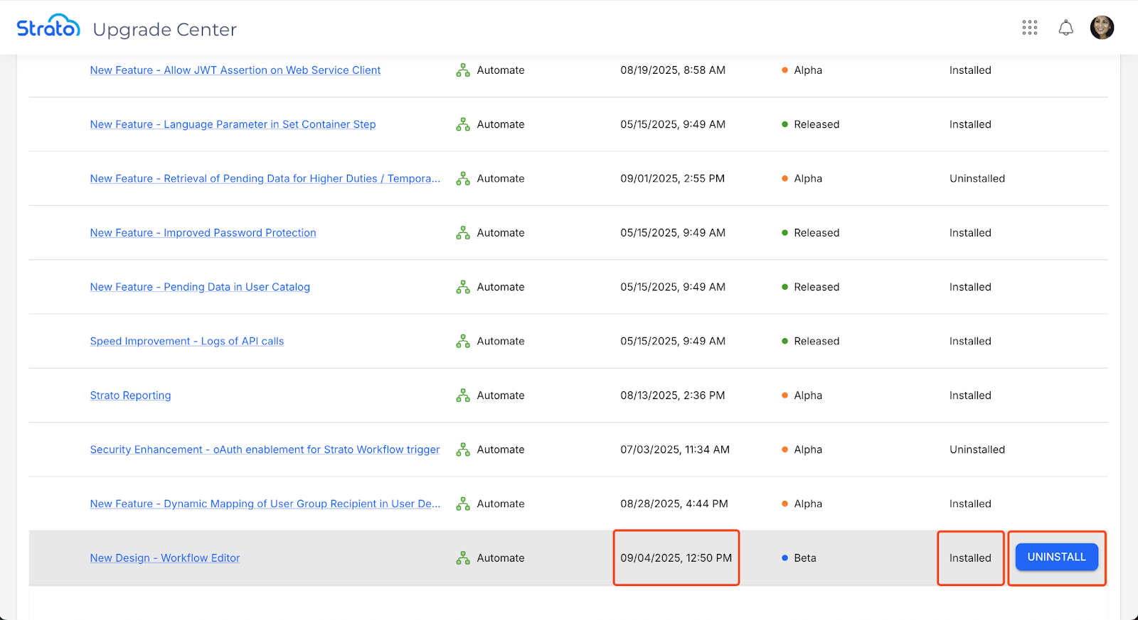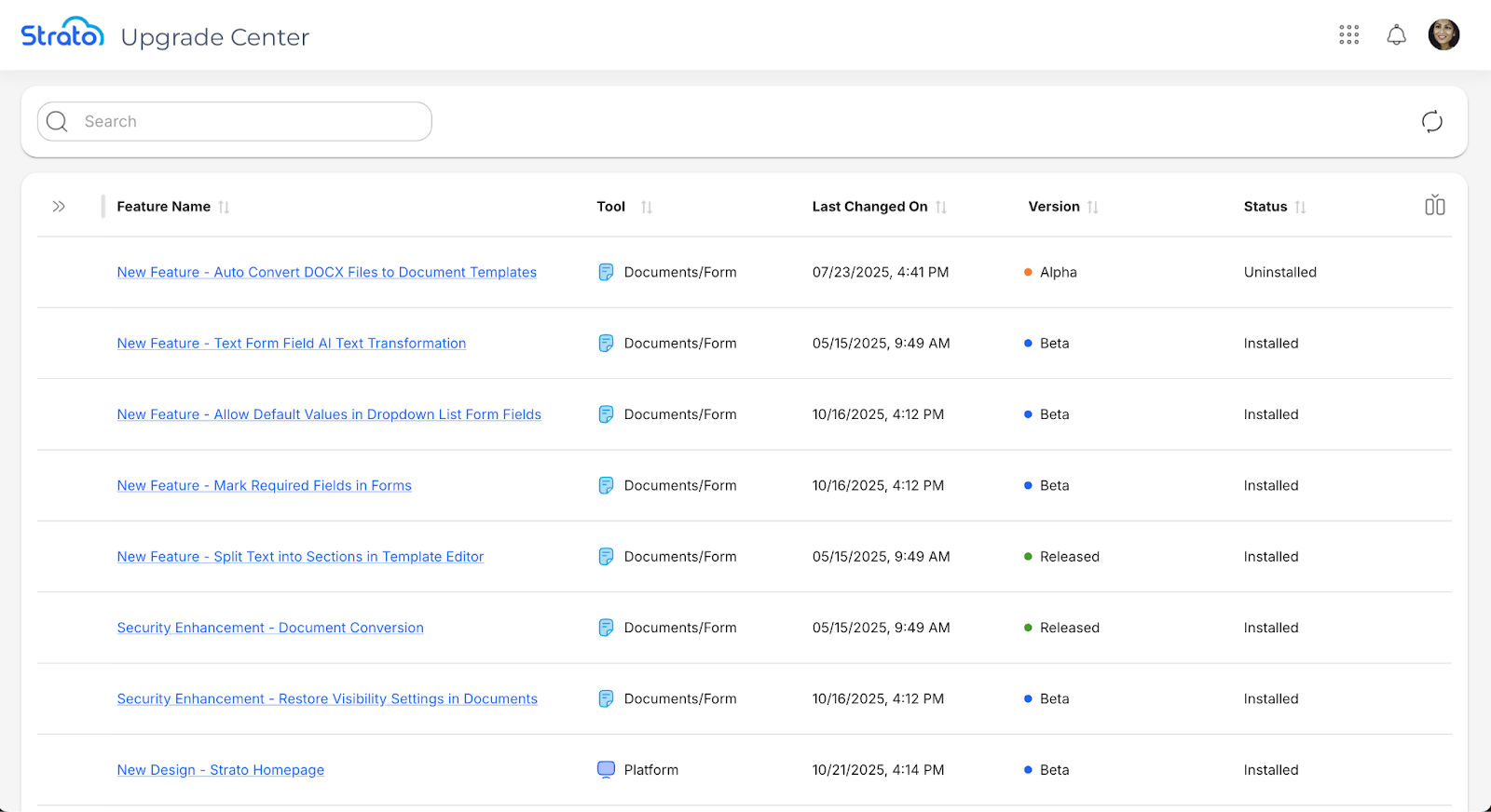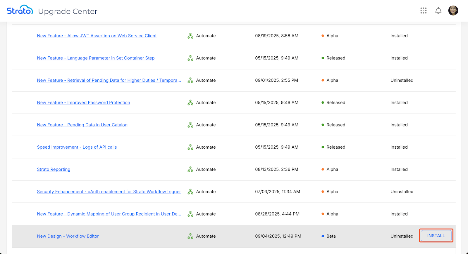 Your permissions from User Management determine if you can manage Alpha and Beta features in the Upgrade Center. Contact your Strato administrator if you need assistance with these permissions.