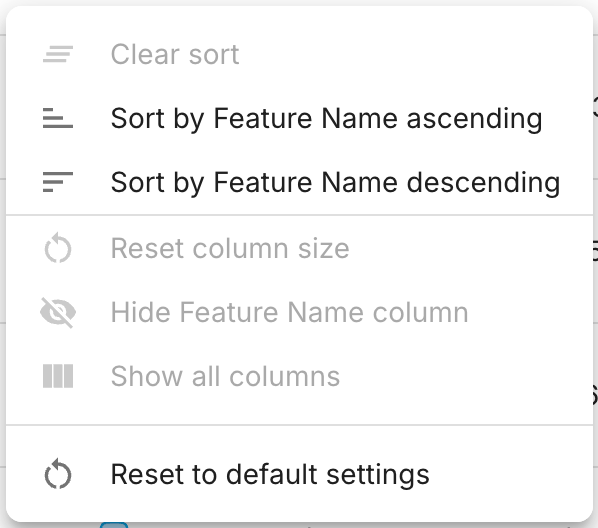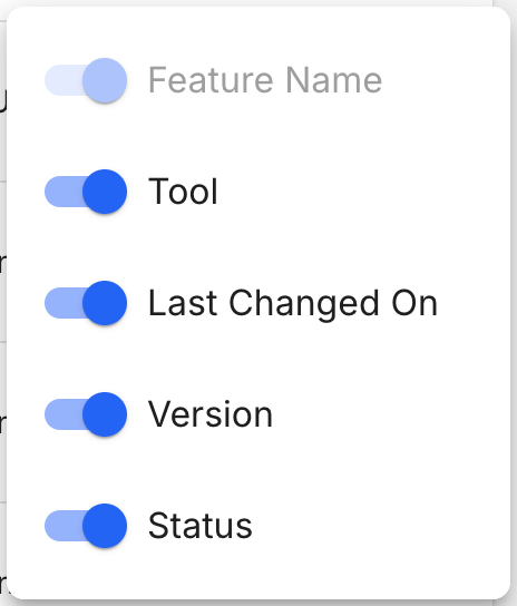 ![]() | The Show/Hide columns button allows you to toggle additional details on and off. Note that the Feature Name column is enabled by default and cannot be toggled off. ![]() |