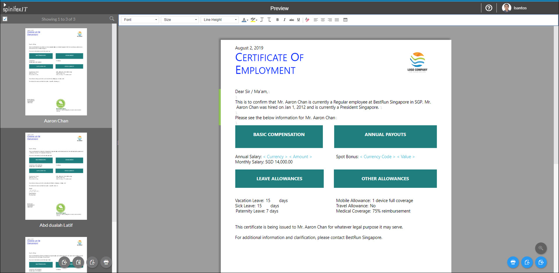 - Document preview - displays the document filled with the data of the employee that is currently selected from the left.