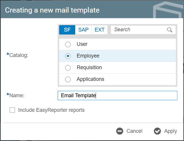 This will prompt a Creating a new mail template dialog box, where you can set which Catalog the Email Template will reference and the name of the Email Template. Click Apply once done configuring.