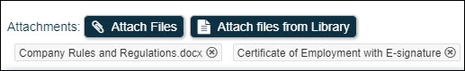 For attachments, you can attach one or more PDF or DOCX files through the Attach Files button. You can also attach one or more Document Templates from the Library through the Attach files from Library button.