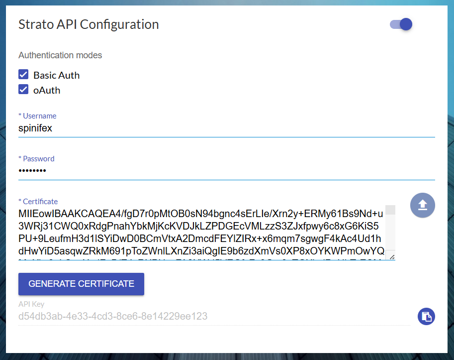 You can enable one or more authentication modes by selecting the checkbox next to each option. This will make their associated fields required.- Basic Auth: Requires a valid Strato Username and Password.