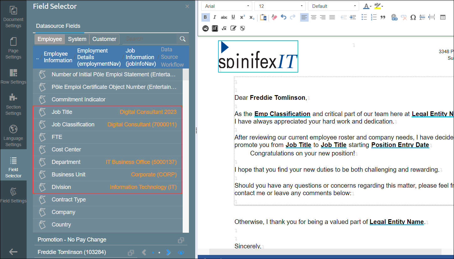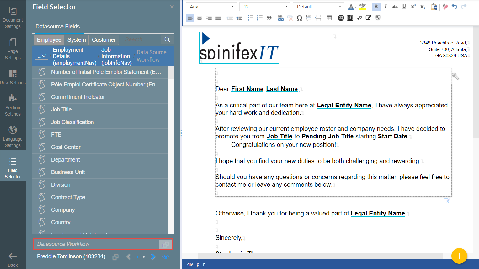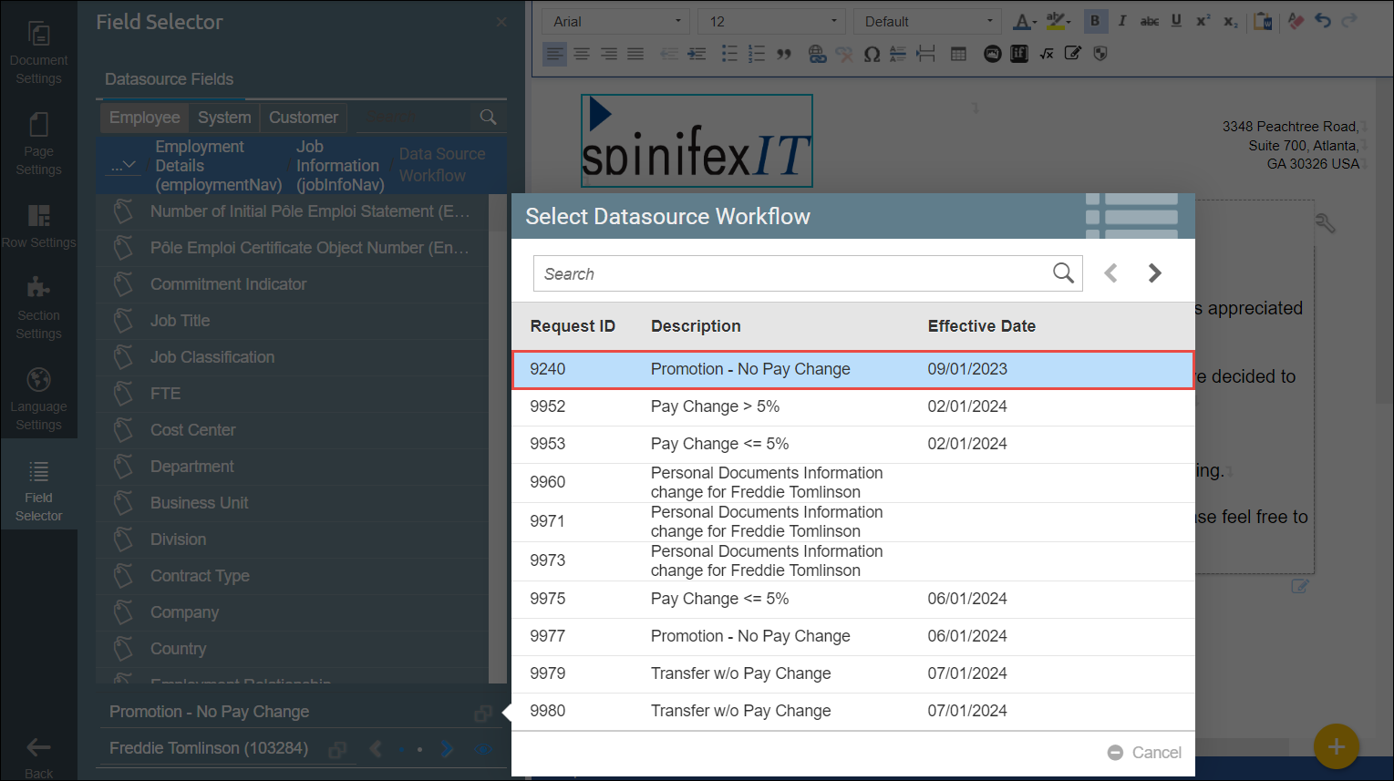 Administrators can preview data from pending SuccessFactors workflows directly within the Strato Document Template Editor. This feature allows you to access datasource workflow actions and verify pending data for specific employees before finalizing a document.