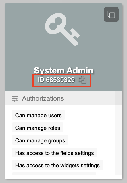 The Role ID, which is used to assign specific role/s via API, is displayed under the role name labeled ID. The copy-to-clipboard icon to its right allows convenient copying.
