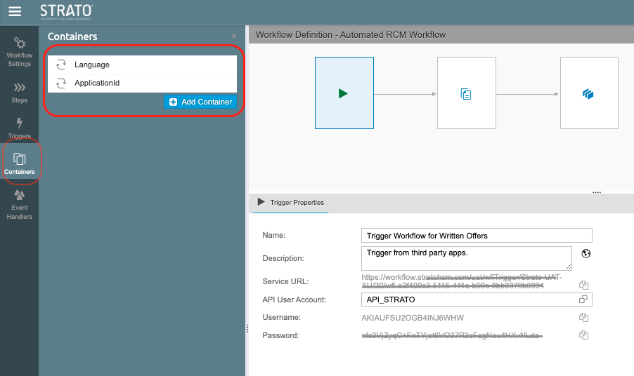 When creating a Strato Workflow template, the Containers (parameters) and Trigger components need to be defined in order for the workflow to know how and when it is going to be automatically executed. The Containers (from the word itself) contain the parameters or holds the variables that need to be imported or exported into the steps within the workflow. Basically, it holds the data being passed around or manipulated within the workflow. On the other hand, the Trigger component in Strato workflow determines how the workflow will be triggered to automatically start its execution.