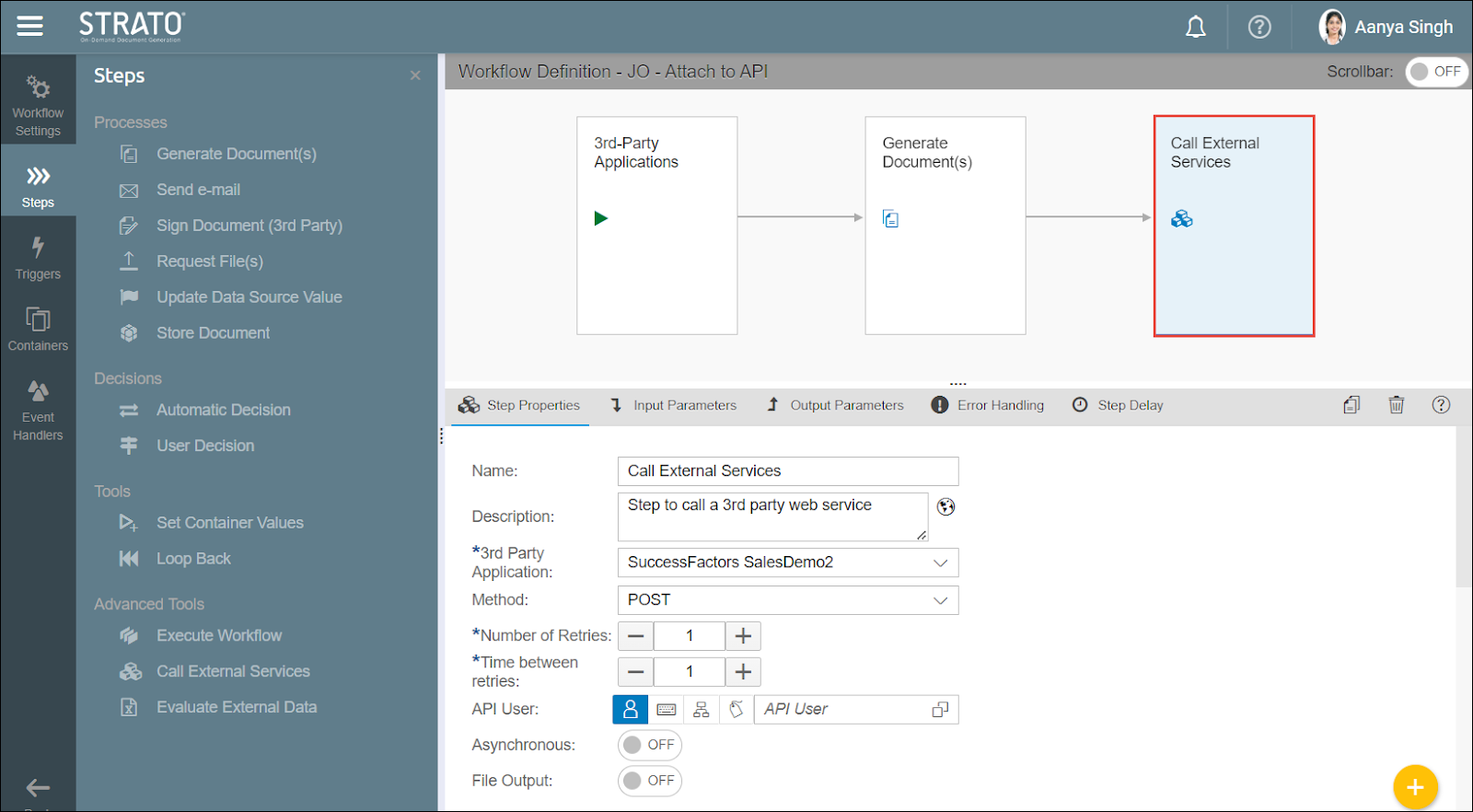- After generating the document, the last step is for the workflow to call the web service client via API and upload the generated document to the 3rd-party application. For example, uploading a Strato document to the Recruiting Module of SuccessFactors via API. (Read the overview of this workflow step here: Call External Services)
