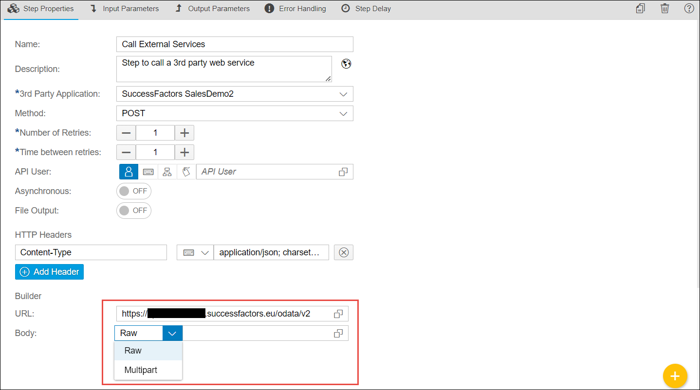 The sample configuration below for the Call External Services starts from step 4 onwards. This example will use the Raw Builder option:
