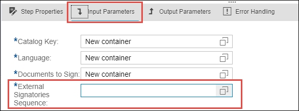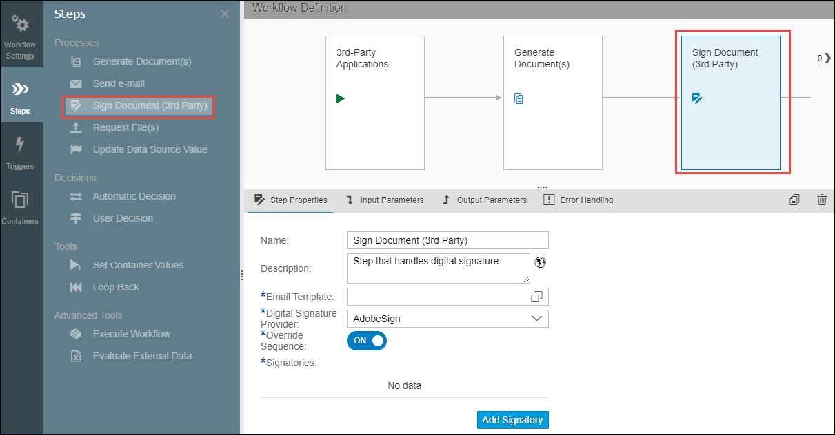 When enabled, this ignores the Signatories settings in the step properties and instead will execute an external sequence which is selected from the Input Parameters tab > External Signatories Sequence option: