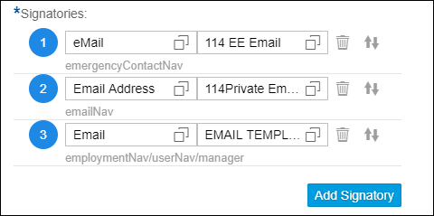 Adding a signatory is simply done by clicking the Add Signatory button (as shown in the screen below). Then select an email field, and the email template to be used for that specific email. So for example, the 1st signatory is the Hiring Manager, then the email template to be used should be specific for that Hiring Manager.